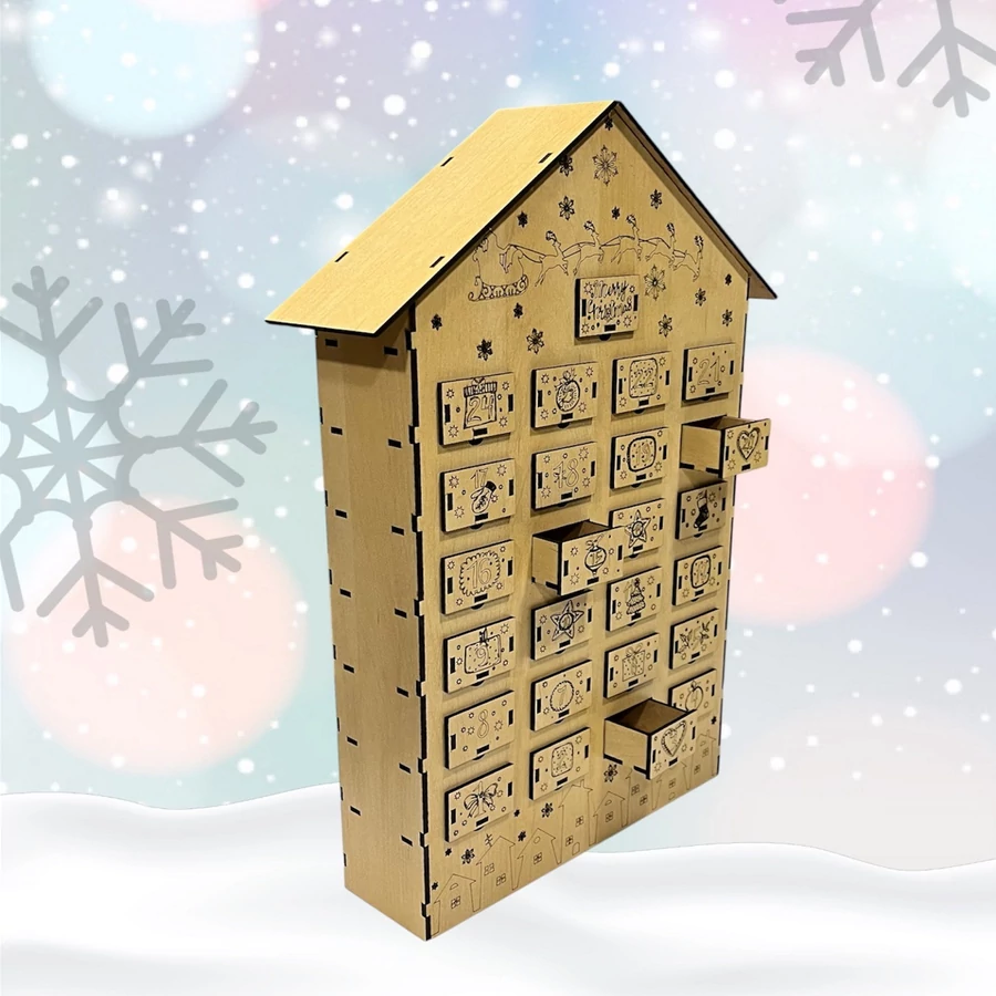 Ez a 3 mm vastag, juharfa színű HDF-ből készült Adventi naptár tökéletes karácsonyi dekoráció. A Mikulás szánon, rénszarvasaival és hópelyhek díszítik az elejét, 24+1 kihúzható fiókja pedig édességeket rejthet a gyerekeknek.
