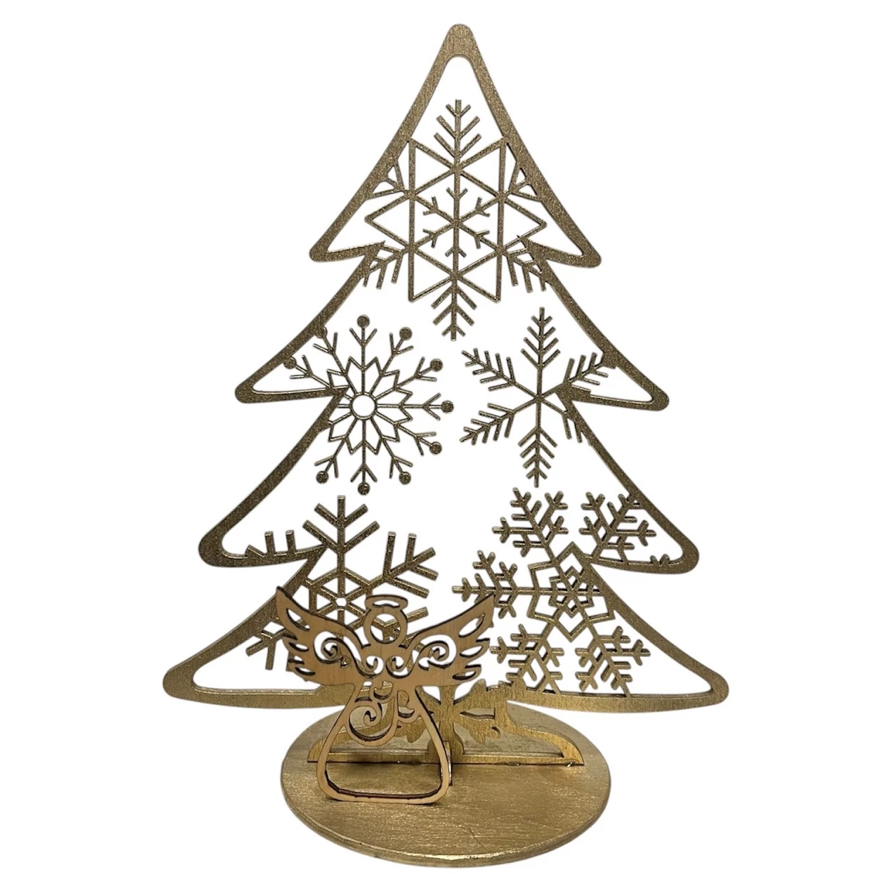 Elegáns arany angyalos karácsonyi asztaldísz lézervágott mintával. Ünnepi hangulat, finom részletek és különleges megjelenés az ünnepi dekorációhoz.