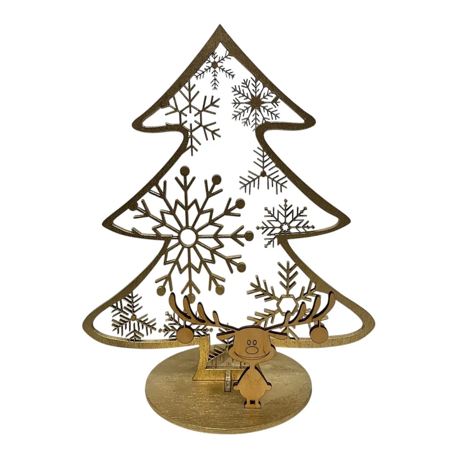 Gyönyörű arany rénszarvasos karácsonyi asztaldísz, részletgazdag lézervágott mintával. Ünnepi melegség és elegancia egyben.