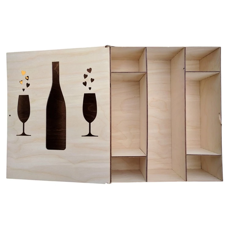 Elegáns, fából készült bortartó doboz pohártartóval. Kiváló ajándék bor- és pezsgőkedvelők számára, természetes megjelenéssel és lézergravírozott mintával.