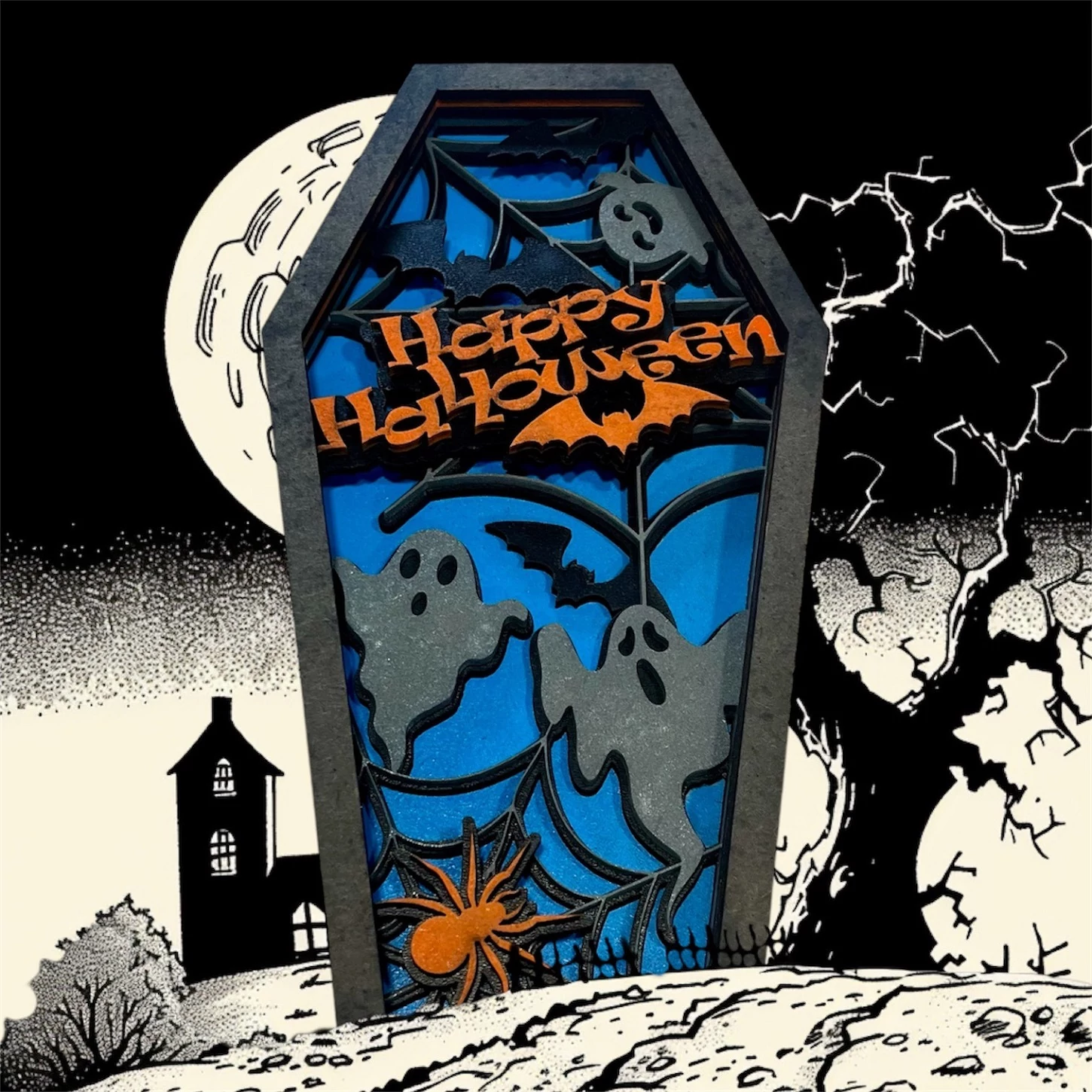 Ez a 3 mm-es HDF lemezből készült, több rétegű Halloween dekoráció egyedi 3D hatással rendelkezik. Koporsó formájú, „Happy Halloween” felirattal, valamint denevér, szellemek, pók és pókháló mintákkal díszítve. A színes kivitel és az aprólékos kidolgozás igazán különlegessé teszi ezt a dekorációt, tökéletes választás Halloween hangulatának megteremtéséhez.