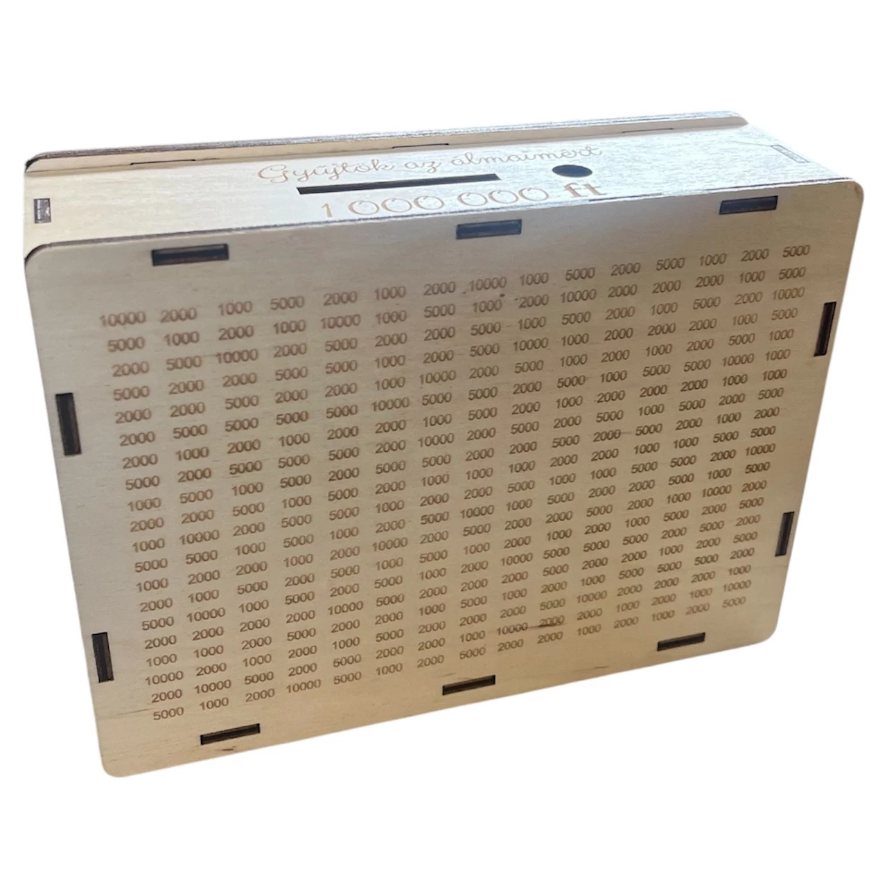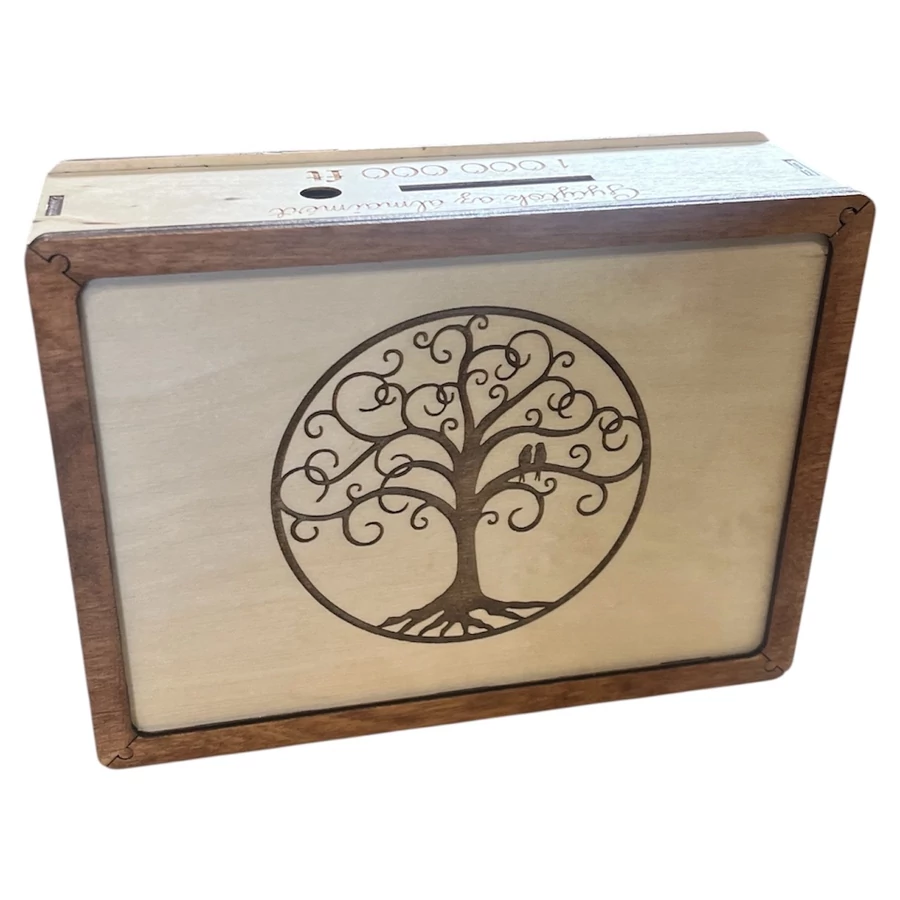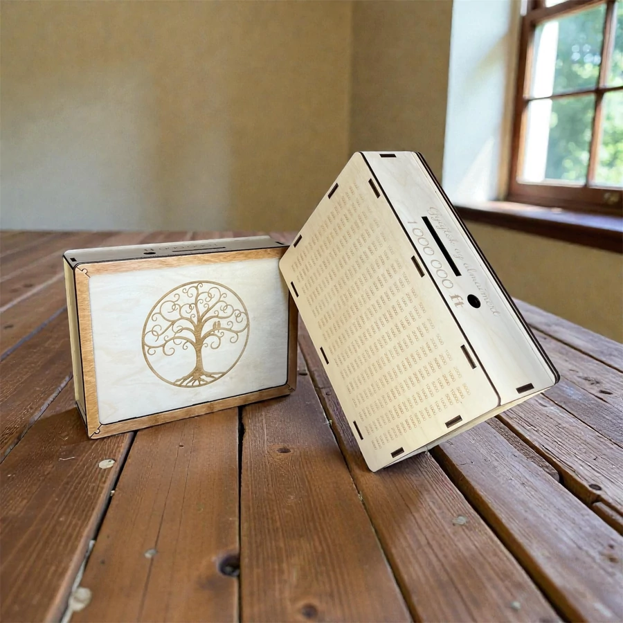 Elegáns, kétoldalas pénzgyűjtő doboz Életfa motívummal, akár 1 millió forint összegyűjtésére. Diszkrét és dekoratív megoldás.