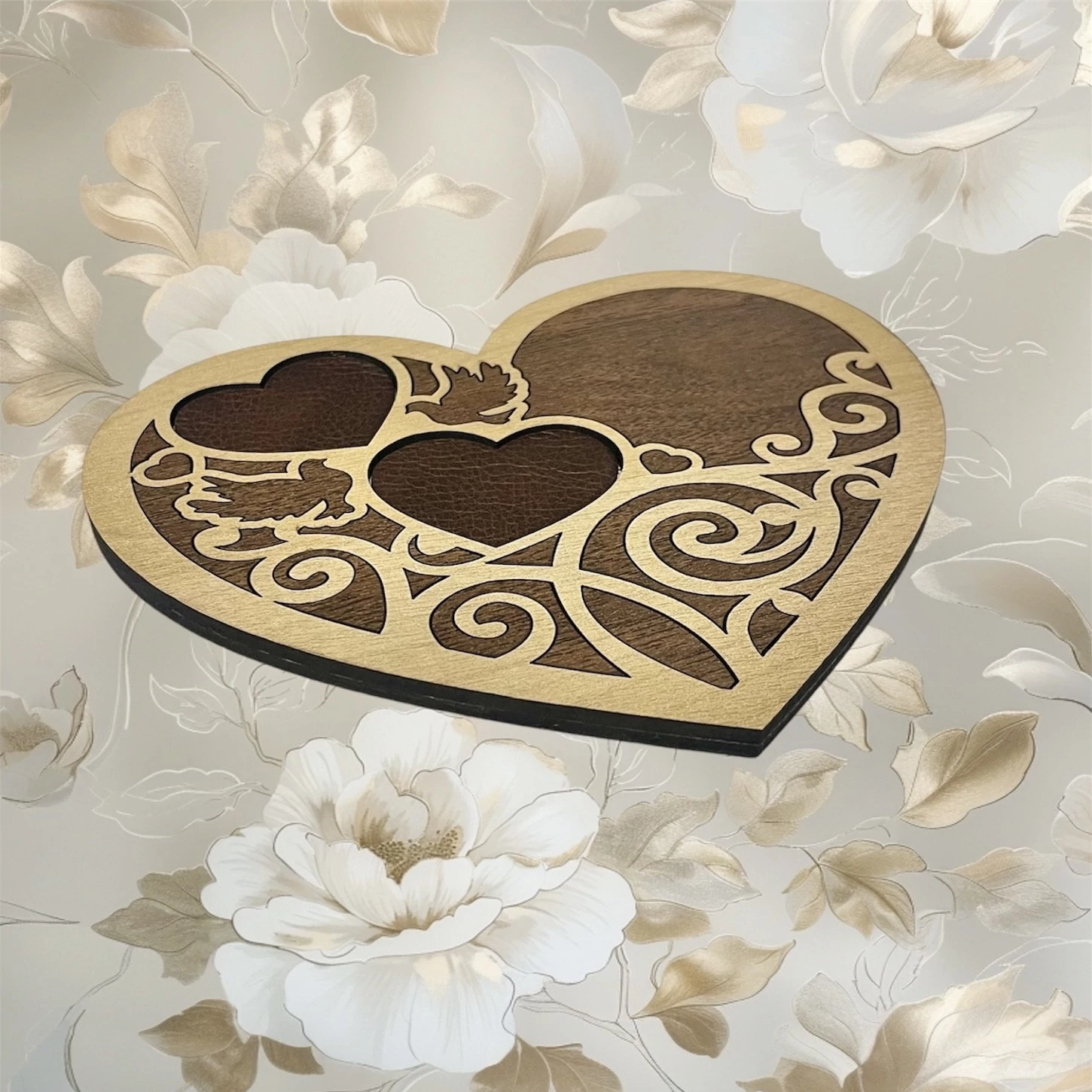 Prémium minőségű szív alakú esküvői gyűrűtartó tálca, bőrrel bélelt mélyedésekkel a gyűrűk védelméért. Galambmotívumokkal díszítve, juhar és dió színkombinációban, stílusos és elegáns kiegészítő az esküvői szertartásra.
