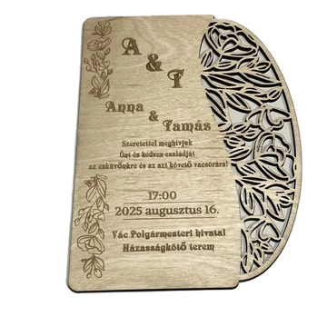 Ez a modern, mégis elegáns fa esküvői meghívó félkör alakú virágmintás díszítéssel készült. Különlegességét a finoman gravírozott részletek adják, egyedi keretet biztosítanak a meghívó szövegének.