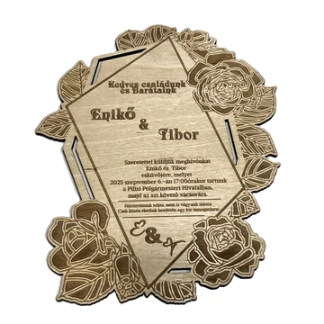Modern és elegáns fa esküvői meghívó geometrikus kerettel és gyönyörű rózsamintával. A különleges tisztult megjelenést biztosító forma le a virágdísz romantikus hangulatot kölcsönöz.
