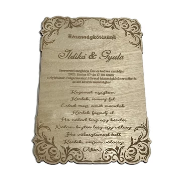 Ez a klasszikus hangulatú, virágmintás esküvői meghívó tökéletes választás azoknak, akik a természetességet szeretnék ötvözni a romantikával. A fa anyag tartósságot biztosít, míg a virágos lézervágott minta különleges díszítőelemként jelenik meg.