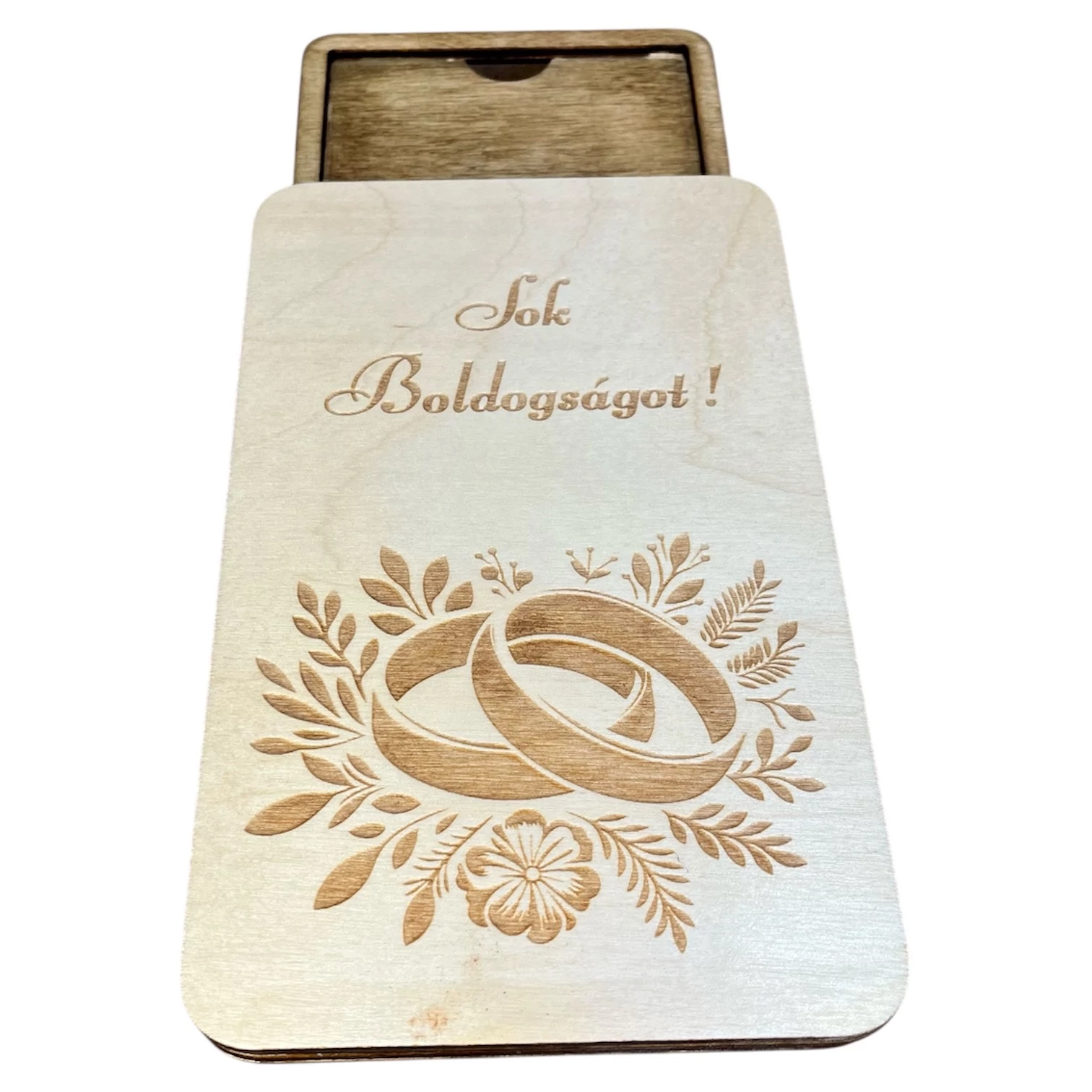 Ez a gravírozott esküvői pénzátadó doboz elegáns és emlékezetes módja a pénz ajándékozásának. A fedlapon található gyűrű motívum a házasság szimbóluma, így tökéletes kiegészítője az esküvői ajándéknak. A természetes fa meleg megjelenést ad, a precíz gravírozás pedig prémium hatást kelt.