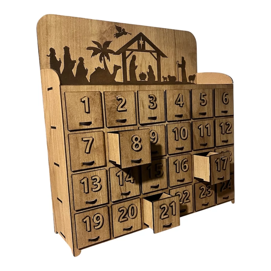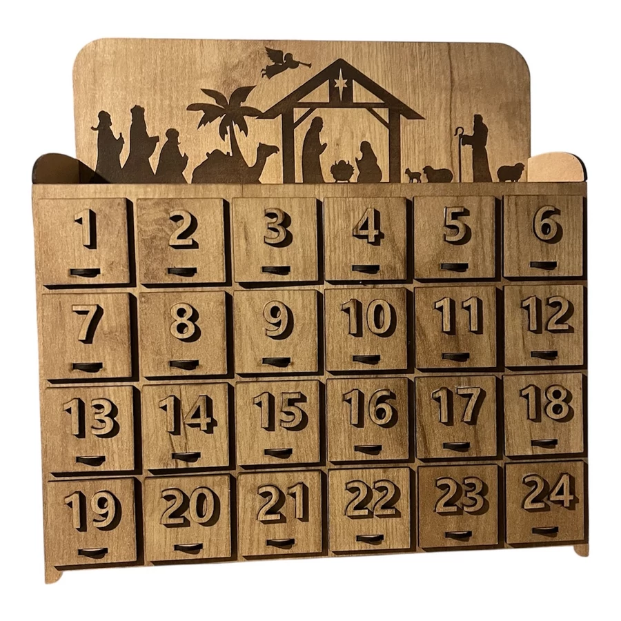 Tölgy színű, fa adventi naptár betlehemes motívummal.