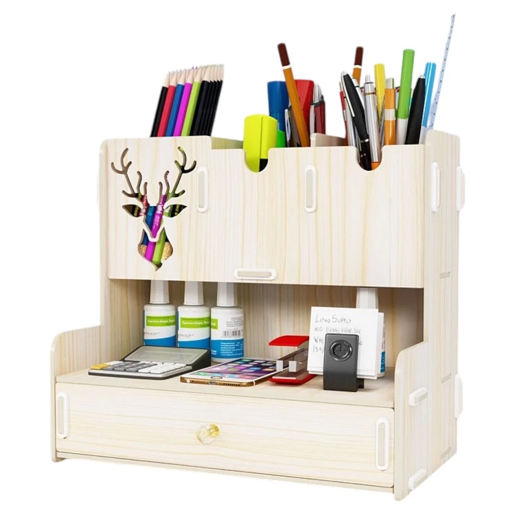 Elegáns és praktikus fa asztali rendszerező több rekesszel és egy fiókkal. Tökéletes tollak, jegyzetek és egyéb irodai kiegészítők tárolására. Stílusos, természetes fa dizájn.