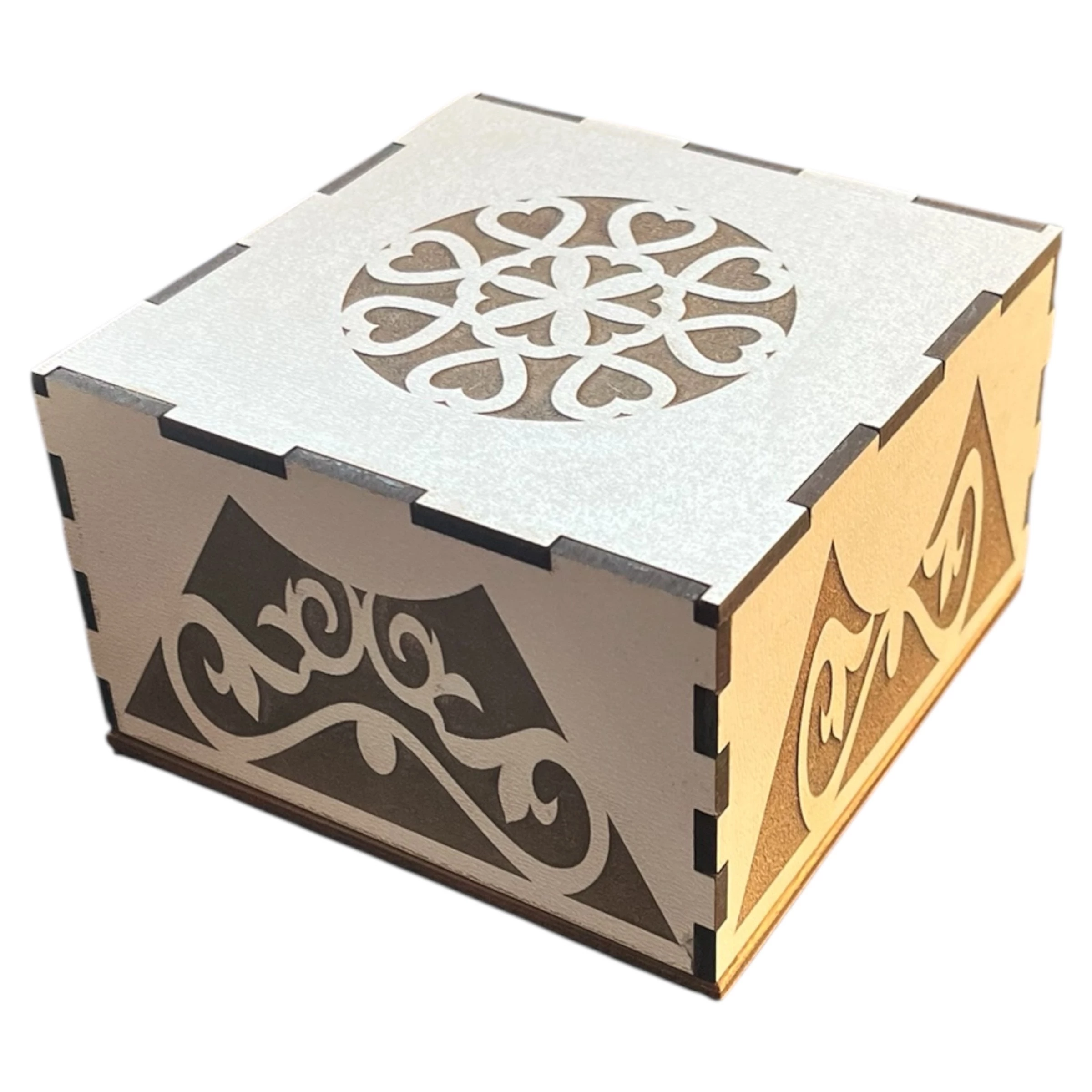 Elegáns, fehér színű gravírozott fa díszdoboz romantikus mintával – tökéletes ajándékcsomagolás vagy ékszertartó.