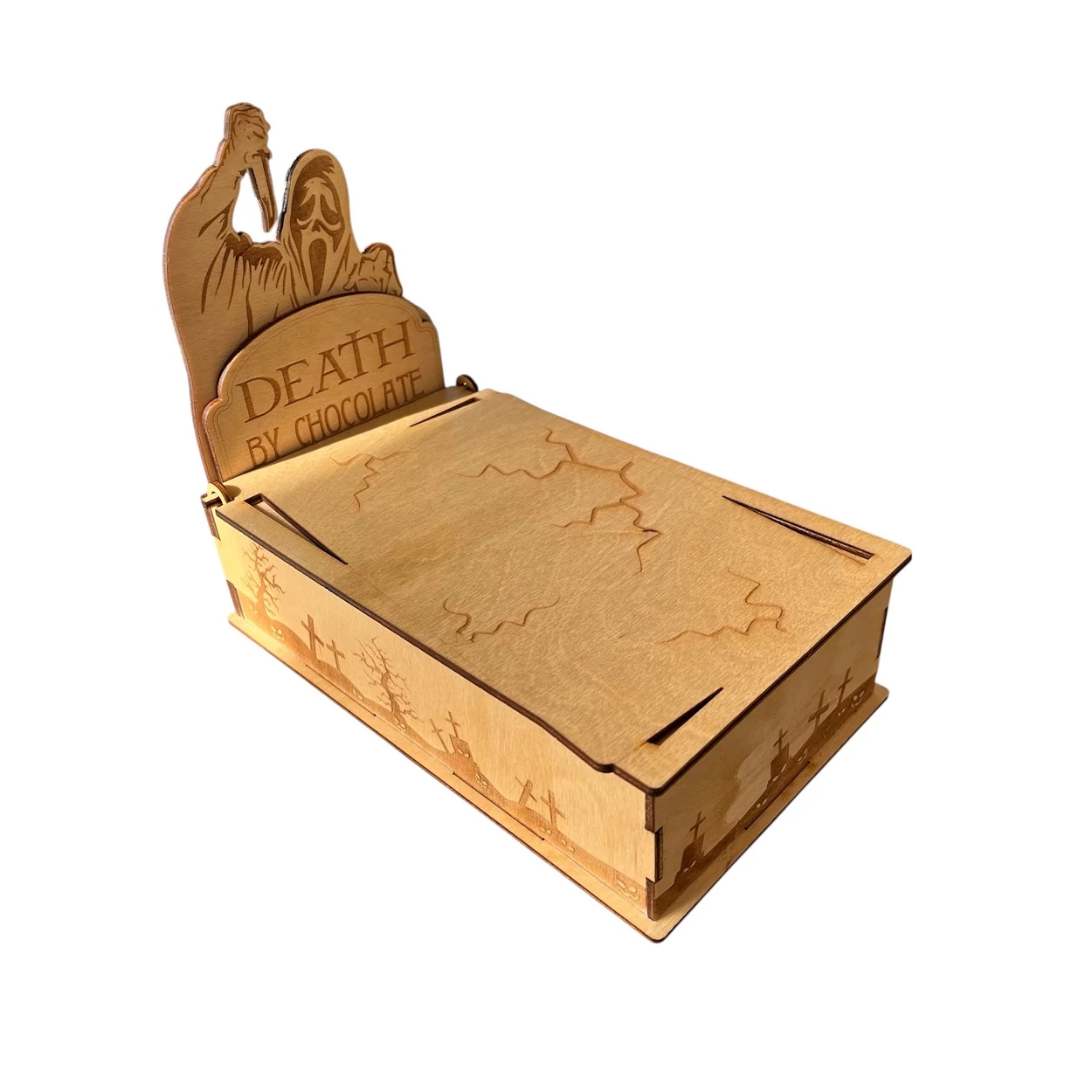 Ha igazán különleges Halloween meglepetést keresel, ez a „Death by Chocolate” sírdoboz tökéletes választás! A fa doboz sírkő formát ábrázol, aprólékos gravírozással és humoros, de hátborzongató felirattal: „Death by Chocolate” .