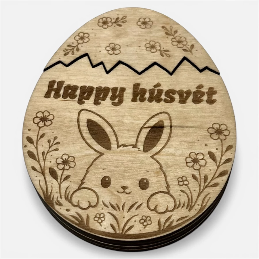 A természetes fa megjelenés és a precíz gravírozás elegáns ajándékká teszi, amely akár húsvéti dekorációként is megőrzhető.