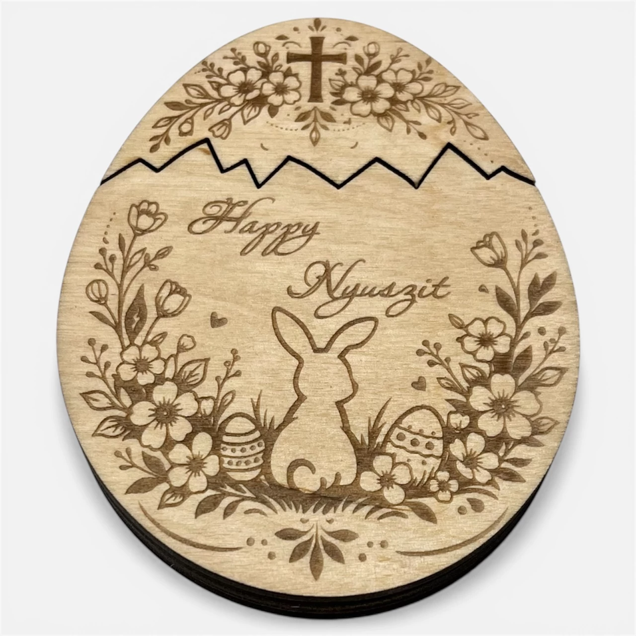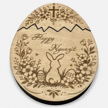 Ez a virágos nyuszis mintával készült húsvéti pénzátadó tojás igazán különleges ajándék lehet húsvétra. A gravírozott díszítés természetes és elegáns megjelenése ad a fából készült dekorációnak.
