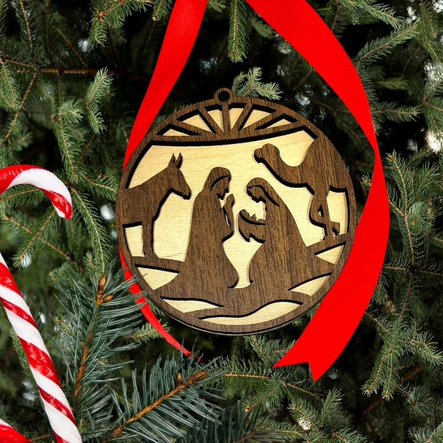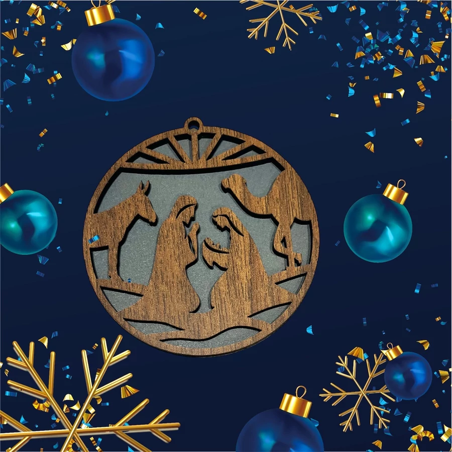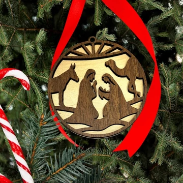 Ez a 3 mm-es rétegeltlemezből készült, kétoldalas dísz Betlehem és Jézus születésének ikonikus jelenetét idézi meg. A dísz dió színű egyik oldal természetes, juhar színű háttérrel rendelkezik, amely elegáns és klasszikus, míg a másik oldal ünnepi ezüst háttérrel tündököl. A részletgazdag kidolgozás és a kétoldalas kivitel különleges karácsonyi hangulatot visz otthonába, időtálló módon díszítve a karácsonyfát.