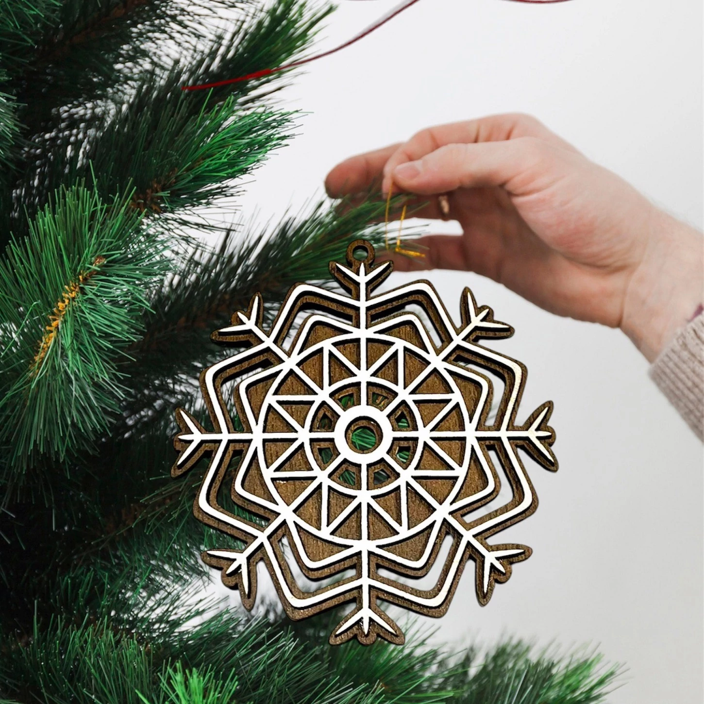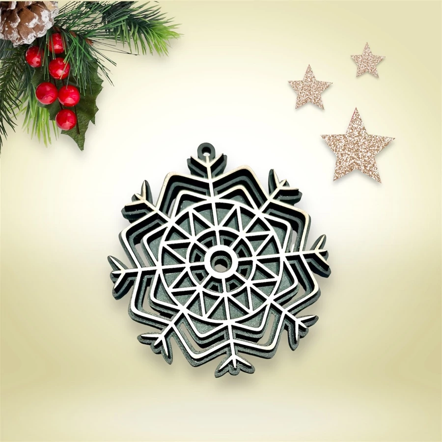 Kétoldalas, hópehely mintájú karácsonyfa dísz 3 mm-es rétegelt lemezből, barna dió és szürke háttérrel. A dísz mindkét oldala részletgazdag kidolgozottságú, így tetszés szerint választható, melyik színnel díszíti a karácsonyfát. Természetes megjelenés és elegáns ünnepi hangulat egy díszben.