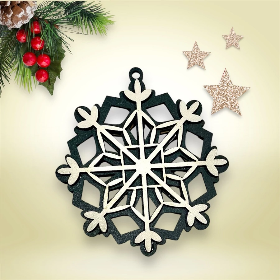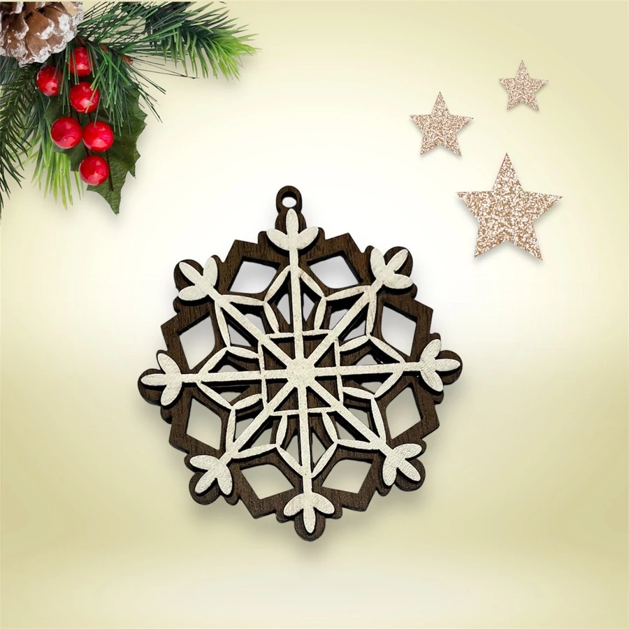 Elegáns, hópehely mintájú karácsonyfadísz, mely 3 mm vastag rétegelt lemezből készült. Kétoldalas kivitelének megfelelő vagy dióbarna szürke háttérrel. A részletgazdag kidolgozás mindkét oldalán gyönyörű megjelenést biztosít, tökéletesen illik bármilyen karácsonyi dekorációhoz.