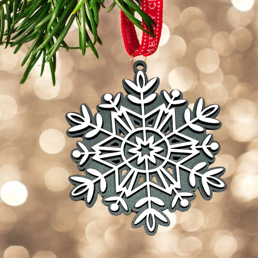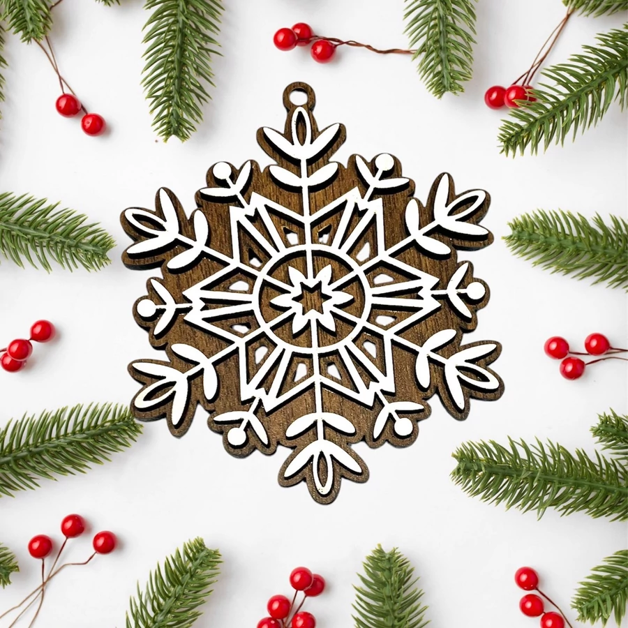 Ez a 3 mm-es rétegelt lemezből készült karácsonyfadísz elegáns hópehely mintázatával és kétoldalas kivitelezésével különleges dísze lesz a karácsonyfájának. Az egyik oldalon barna dió szín, míg a másikon szürke háttér található, így választható, hogy melyik oldal legyen látható. Részletgazdag kidolgozottsága biztosítja, hogy bármilyen karácsonyi dekorációhoz tökéletesen illeszkedjen.