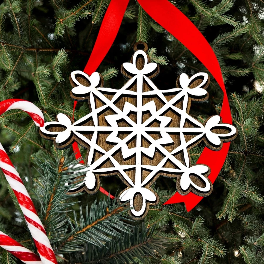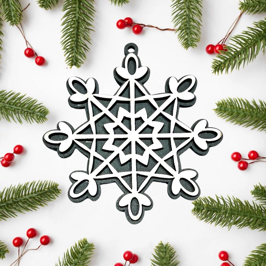 Ez a 3 mm-es rétegelt lemezből készült karácsonyfadísz elegáns hópehely mintázatával és kétoldalas kivitelezésével különleges dísze lesz a karácsonyfájának. Az egyik oldalon barna dió szín, míg a másikon szürke háttér található, így választható, hogy melyik oldal legyen látható. Részletgazdag kidolgozottsága biztosítja, hogy bármilyen karácsonyi dekorációhoz tökéletesen illeszkedjen.