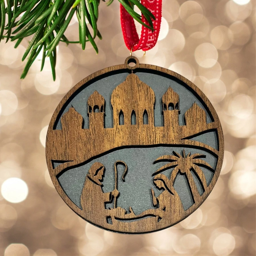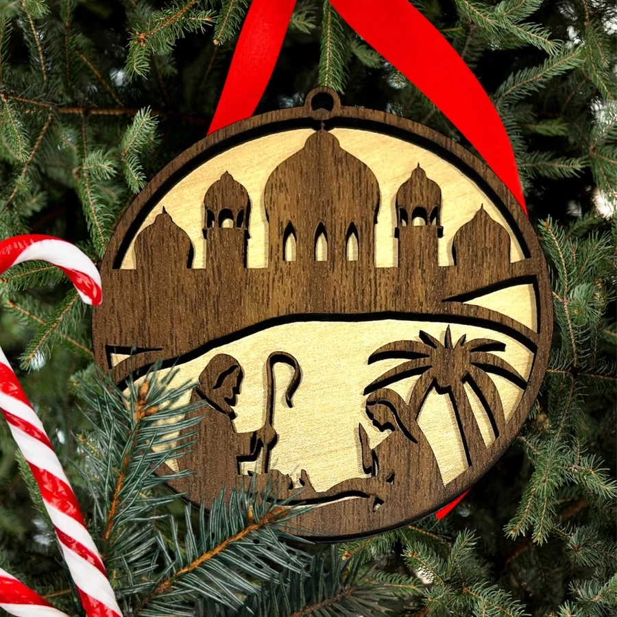 Ez a 3 mm-es rétegeltlemezből készült, kétoldalas dísz Betlehem és Jézus születésének ikonikus jelenetét idézi meg. A dísz dió színű egyik oldal természetes, juhar színű háttérrel rendelkezik, amely elegáns és klasszikus, míg a másik oldal ünnepi ezüst háttérrel tündököl. A részletgazdag kidolgozás és a kétoldalas kivitel különleges karácsonyi hangulatot visz otthonába, időtálló módon díszítve a karácsonyfát.