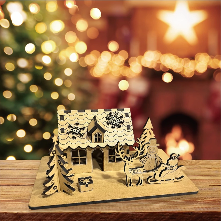 Hozzon ünnepi varázslatot otthonába ezzel az egyedi, 3 mm-es hdf lemezből készült karácsonyi asztaldísszel! Ez a bájos téli jelenet egy hópelyhekkel díszített kis házikót ábrázol, amely előtt és mellett karácsonyi elemek elevenednek meg: egy fenyőfa, egy Mikulás szánkón rénszarvassal, valamint egy vidám hóember az udvaron.
