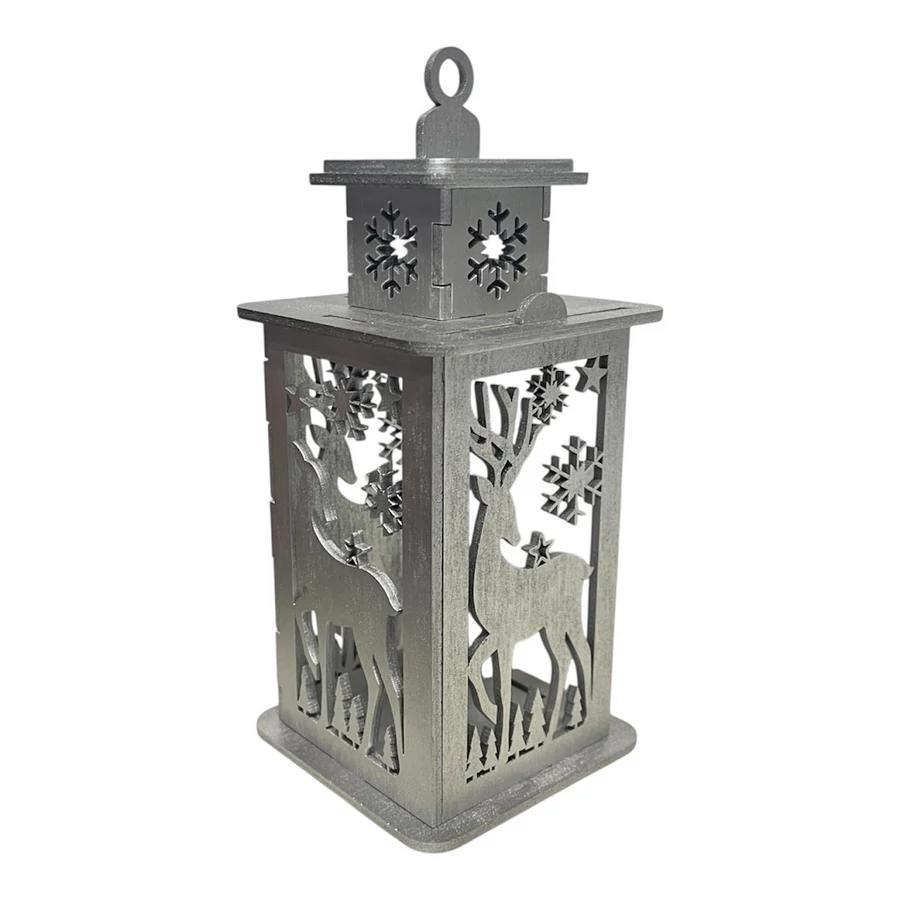 A szarvasos karácsonyi mécsestartó elegáns ezüst színben készült, lézervágott mintával, amely meleg fényt enged át.