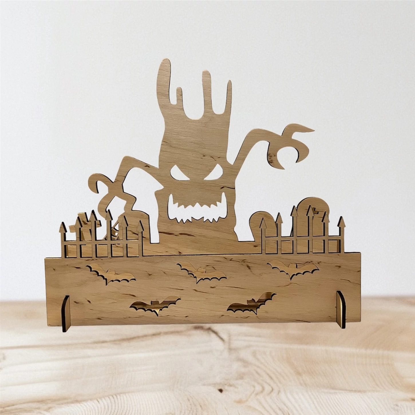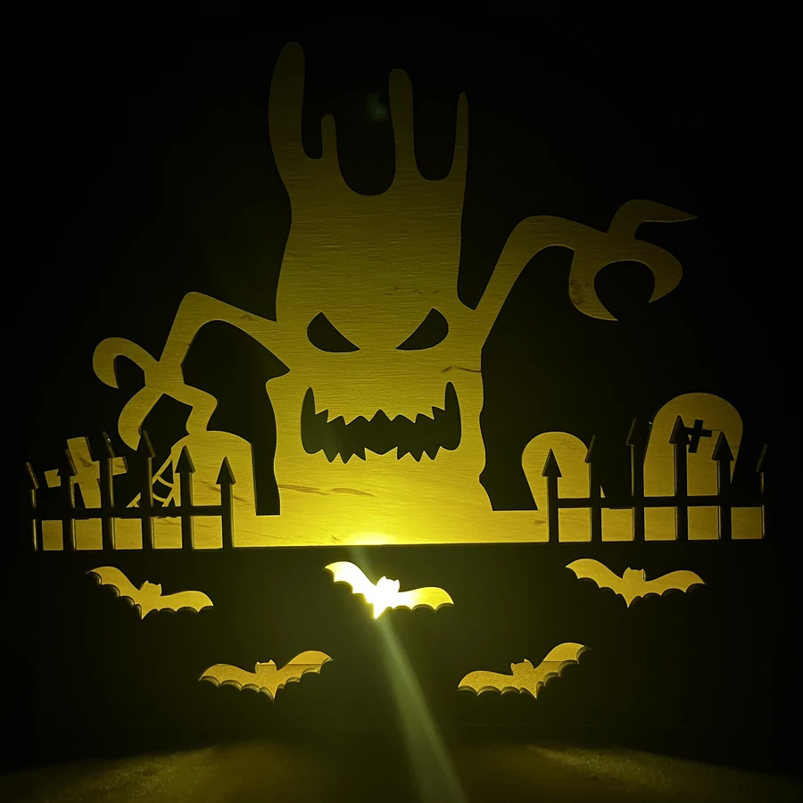 3 mm vastag rétegelt lemezből készült dekoráció, amely bármely Halloween-rajongót elvarázsol. A háttérben egy idős, hatalmas fa tűnik fel, az öreg fa ágai közt pedig egy rémisztő vigyor rejtőzik, ami biztosan néhány pillanat alatt átvisz téged és vendégeidet egy sötét erdő hangulatába. A dekorációt élénkíti néhány denevér is, amelyek hozzájárulnak a szellemes atmoszférához.