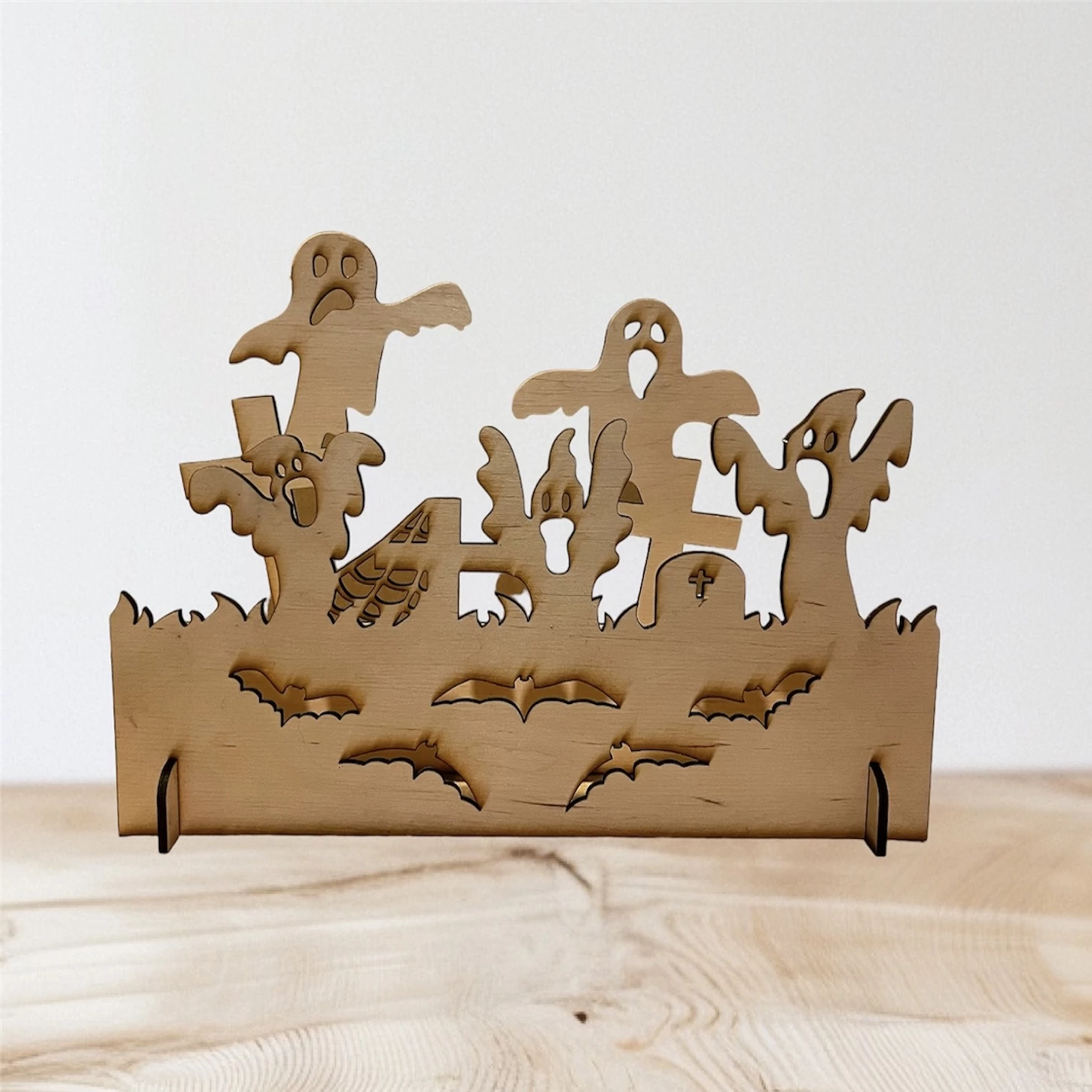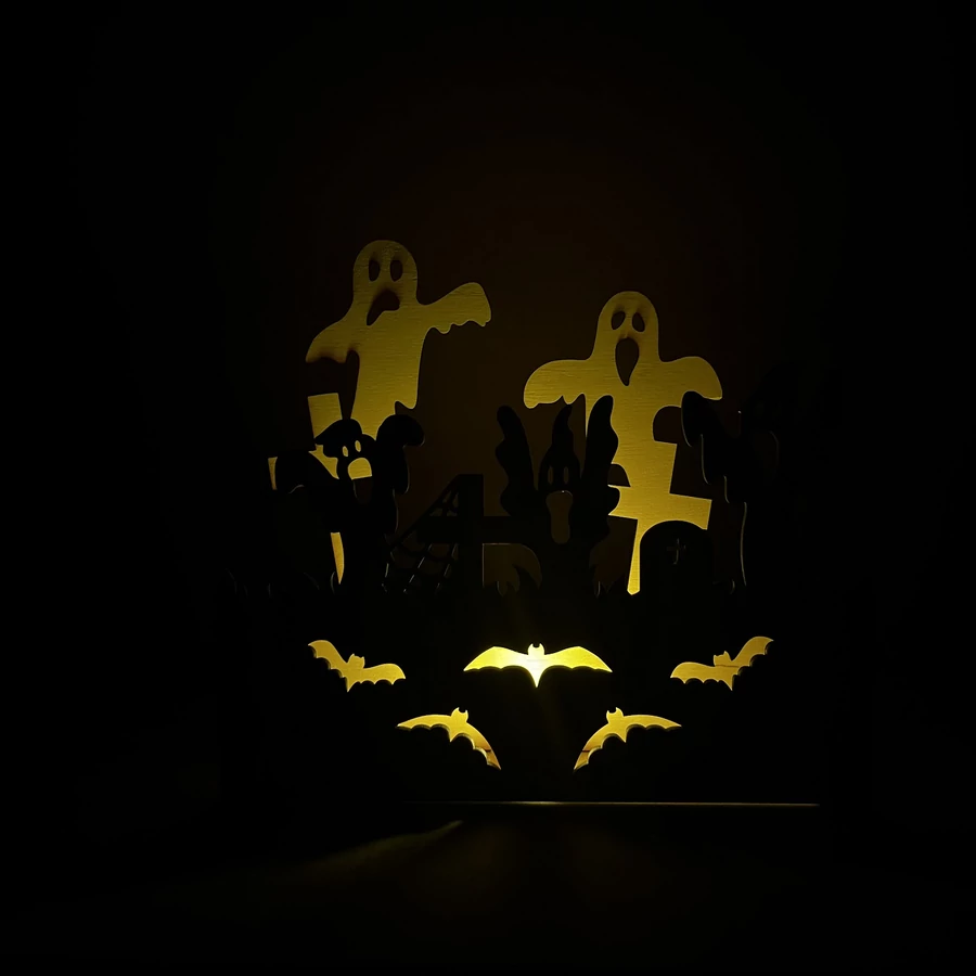 3 mm vastag rétegelt lemezből készült dekoráció, amely bármely Halloween-rajongót elvarázsol. A temetőben szellemek garázdálkodnak, ami biztosan néhány pillanat alatt átvisz téged és vendégeidet a Halloweeni borzongásba. A dekorációt élénkíti néhány denevér is, amelyek hozzájárulnak a szellemes atmoszférához.