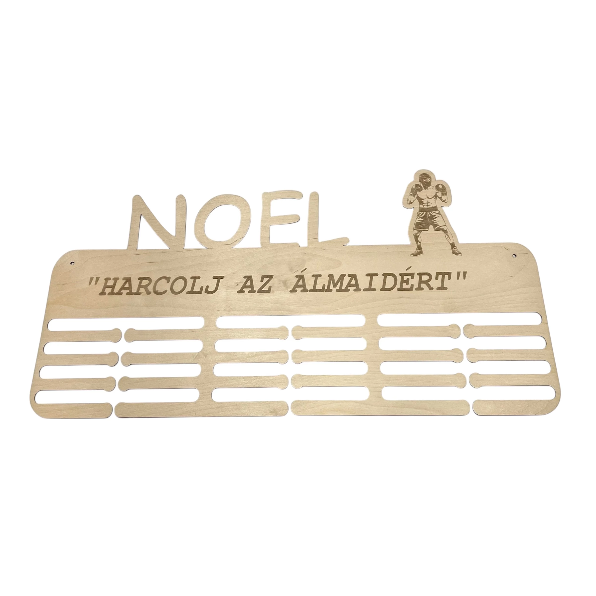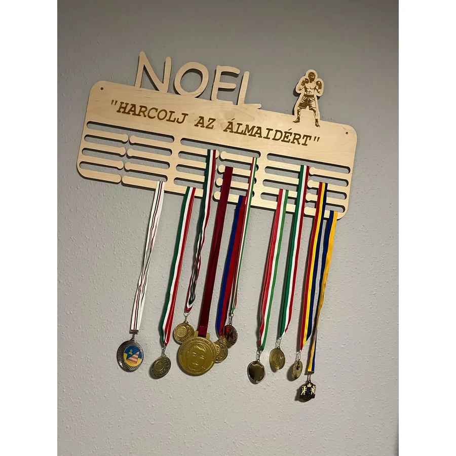 Ez a különleges, lézervágott fa éremtartó tökéletes választás minden sportoló számára, aki szeretné méltó módon bemutatni elért sikereit. A termék egyedi bokszoló mintával, névvel és motivációs felirattal ("Harcolj az álmaidért") készült, amely még személyesebbé teszi az összhatást. A tartó számos érem tárolására alkalmas, legyen szó bokszról, küzdősportokról vagy bármely más sportágról.