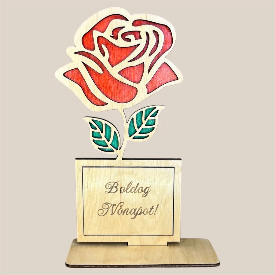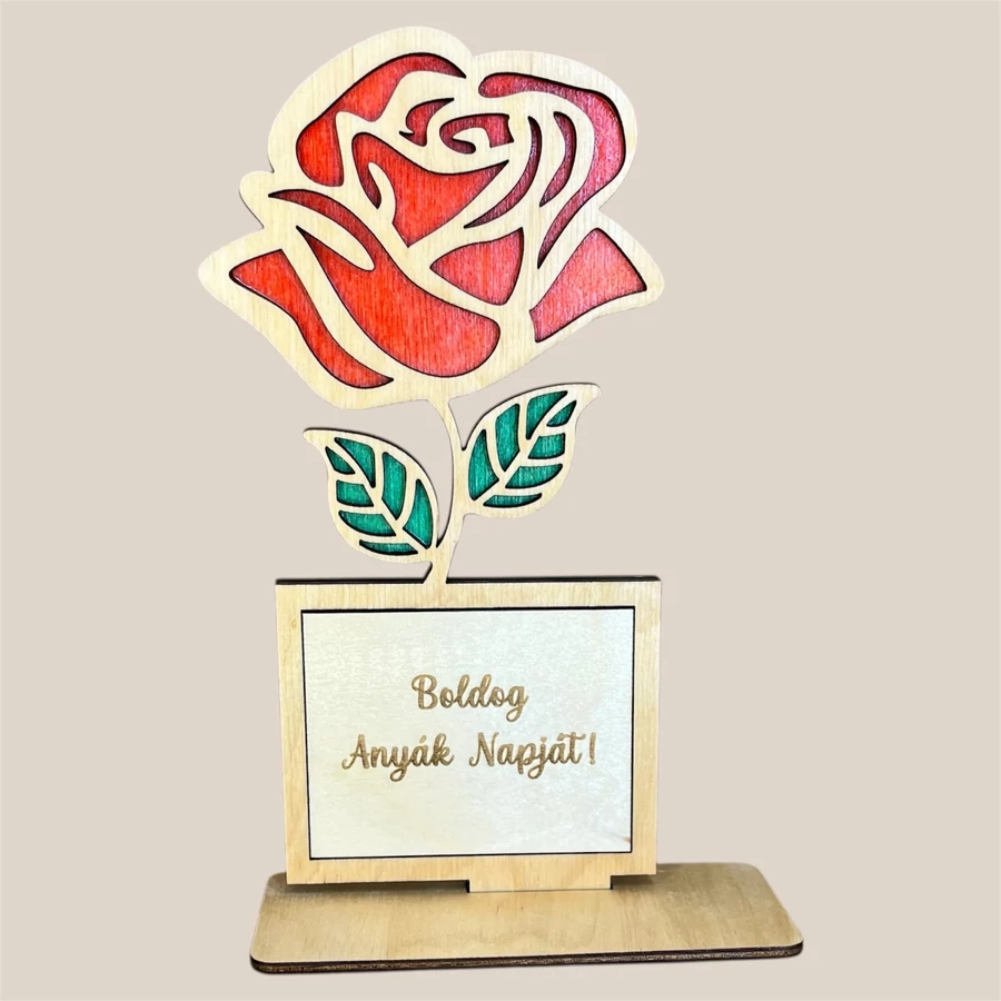 Elegáns, lézervágott fa rózsa dísz személyre szabható felirattal és színekkel. Tökéletes ajándék Anyák napjára, nőnapra vagy bármilyen különleges alkalomra.