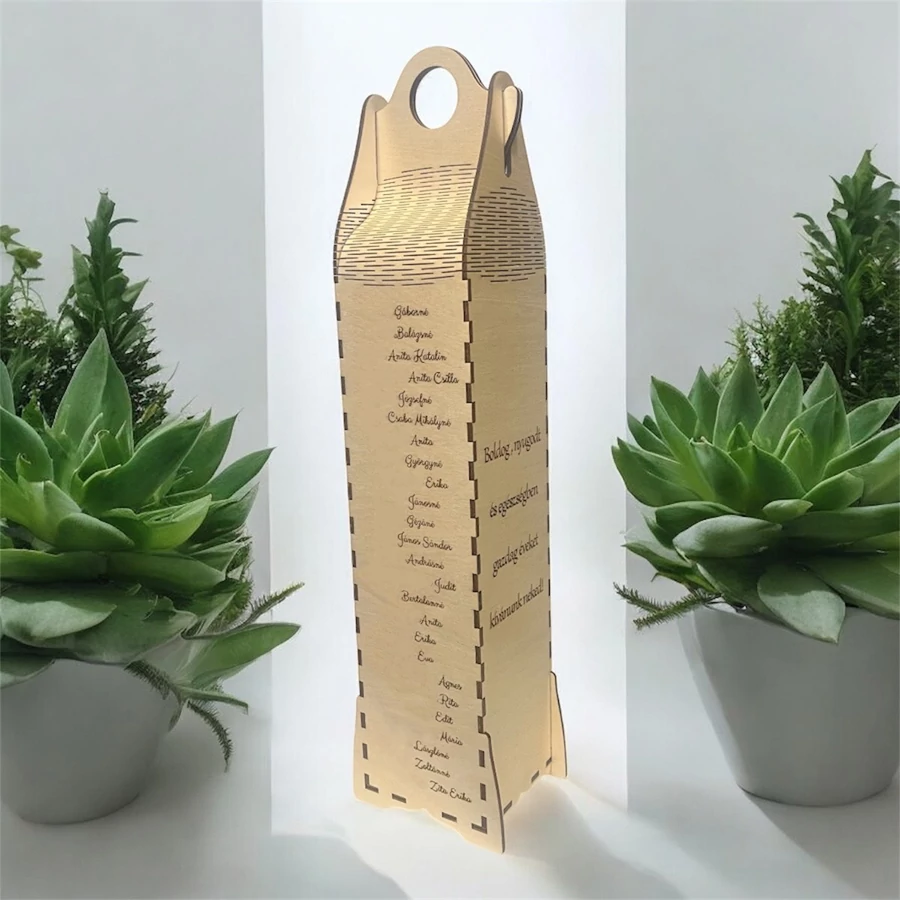 Eleged van a szokványos papír ajándéktasakokból? Ez a 3mm vastag rétegelt lemezből készült bortartó díszdoboz tökéletes választás, ha valami különlegeset keresel.