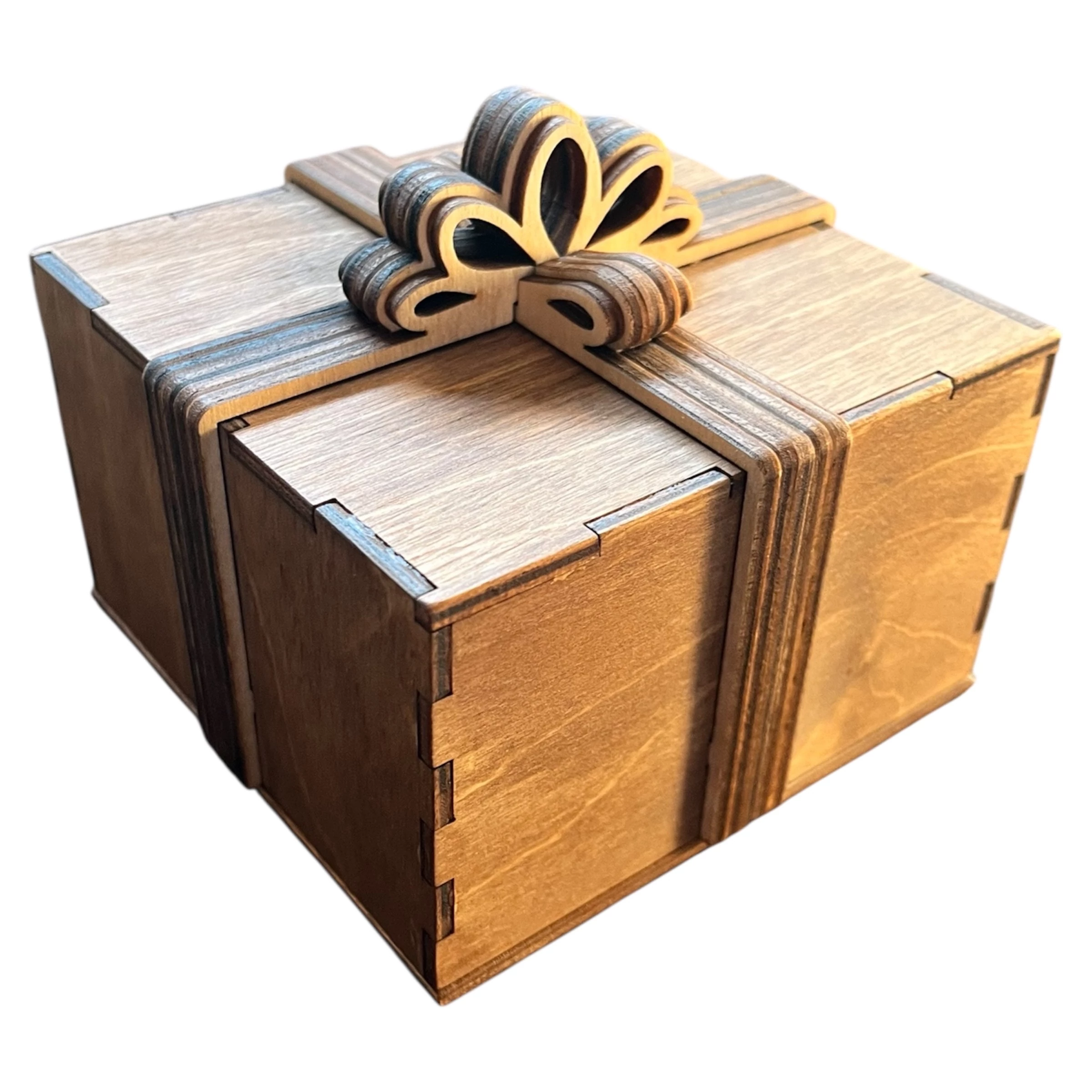 Elegáns, tölgy színű fa díszdoboz egyedi megjelenéssel. Tökéletes ajándékcsomagolásnak vagy ékszerek, apró kincsek tárolására.