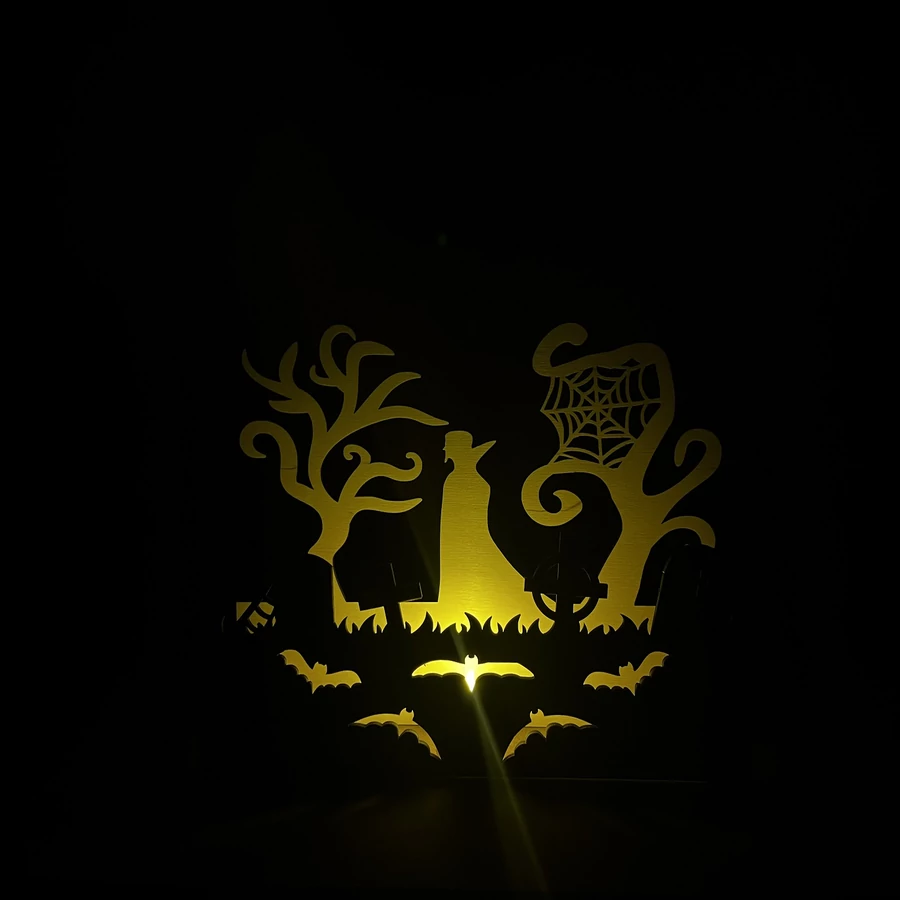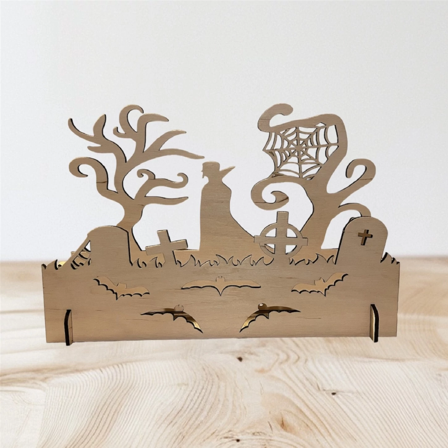 3 mm vastag rétegelt lemezből készült dekoráció, amely bármely Halloween-rajongót elvarázsol. A temetőben egy vámpir rejtőzik, ami biztosan néhány pillanat alatt átvisz téged és vendégeidet a Halloweeni borzongásba. A dekorációt élénkíti néhány denevér is, amelyek hozzájárulnak a szellemes atmoszférához.